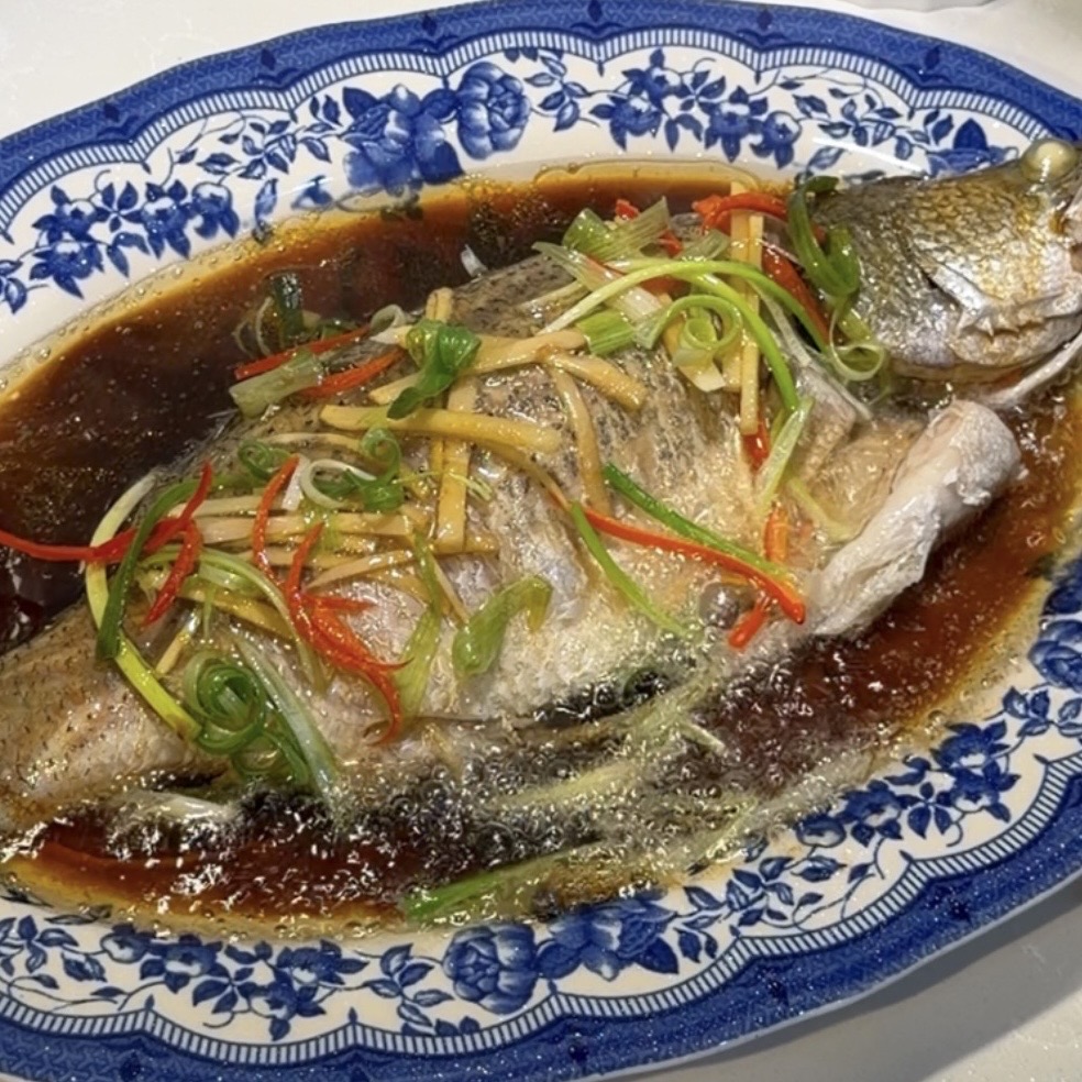 The hot oil quickly releases the aroma of the ginger, spring onions, and chilli, creating that signature fragrant sizzle. It also lightly cooks the fresh toppings and helps carry their flavour across the fish.